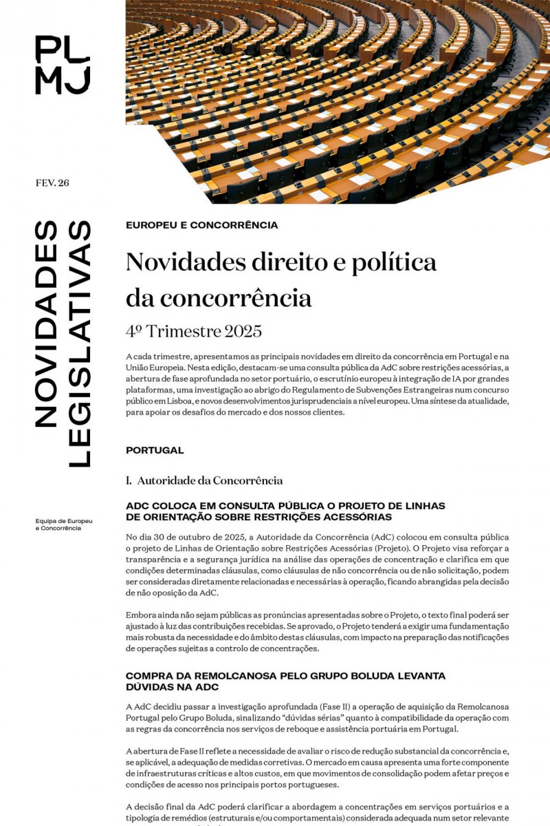 Nesta edição, destacam-se uma consulta pública da AdC sobre restrições acessórias, a abertura de fase aprofundada no setor portuário, o escrutínio europeu à integração de IA por grandes plataformas, uma investigação ao abrigo do Regulamento de Subvenções Estrangeiras num concurso público em Lisboa, e novos desenvolvimentos jurisprudenciais a nível europeu.